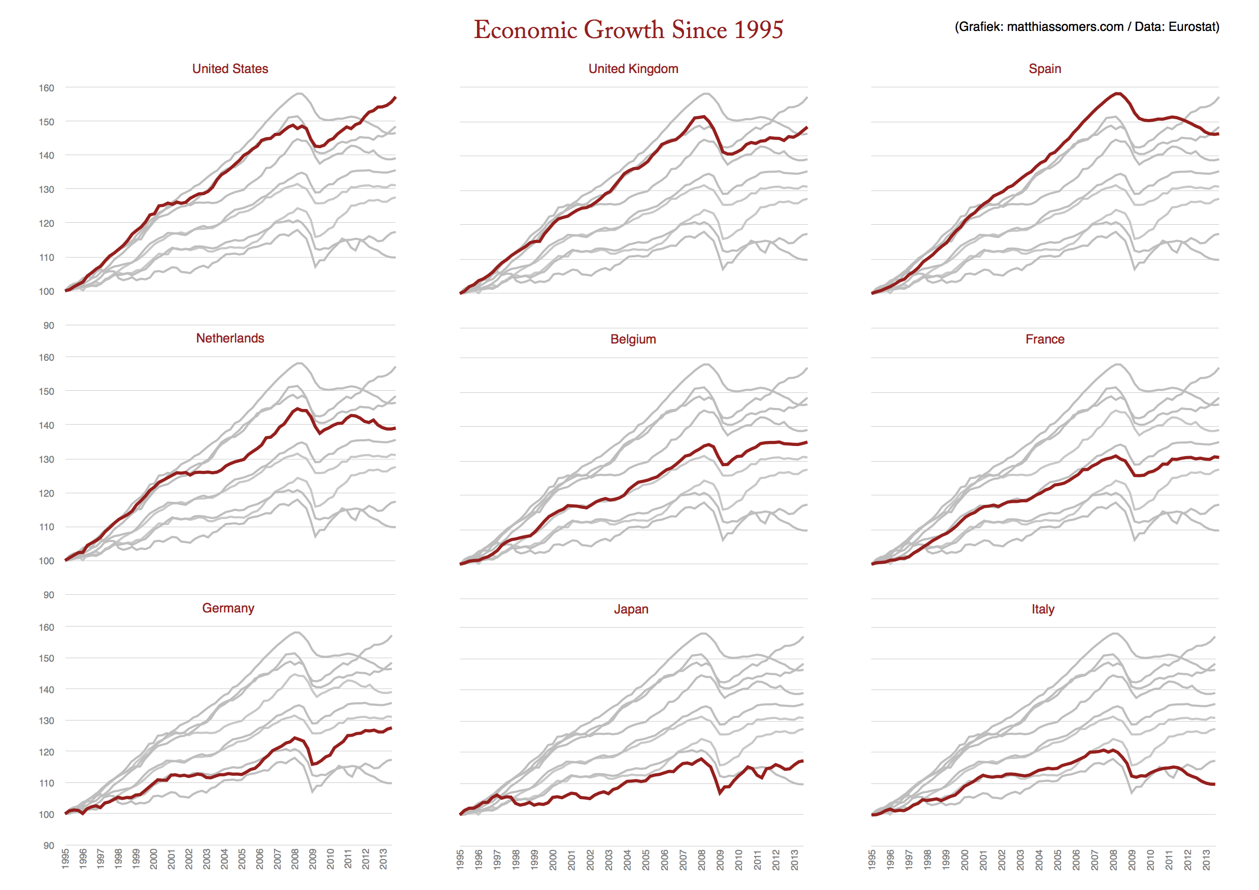 Italië zit in een heel andere categorie: kon het lang Duitsland bijbenen –al was dat niet echt een kunst, als je de Duitse prestaties tot dan bekijkt–, met de crisis kreeg het een klop van de hamer, en die hamer blijft maar kloppen. Ook Nederland, dat voor de crisis goed presteerde, lijkt de post-Lehmanwereld nog minder goed te verteren dan andere landen: terwijl Frankrijk het economische peil van vlak voor de crisis eindelijk terug heeft bereikt en België en Duitsland die grens ondertussen weer (nipt) hebben doorbroken, blijft het bbp in Nederland krimpen.