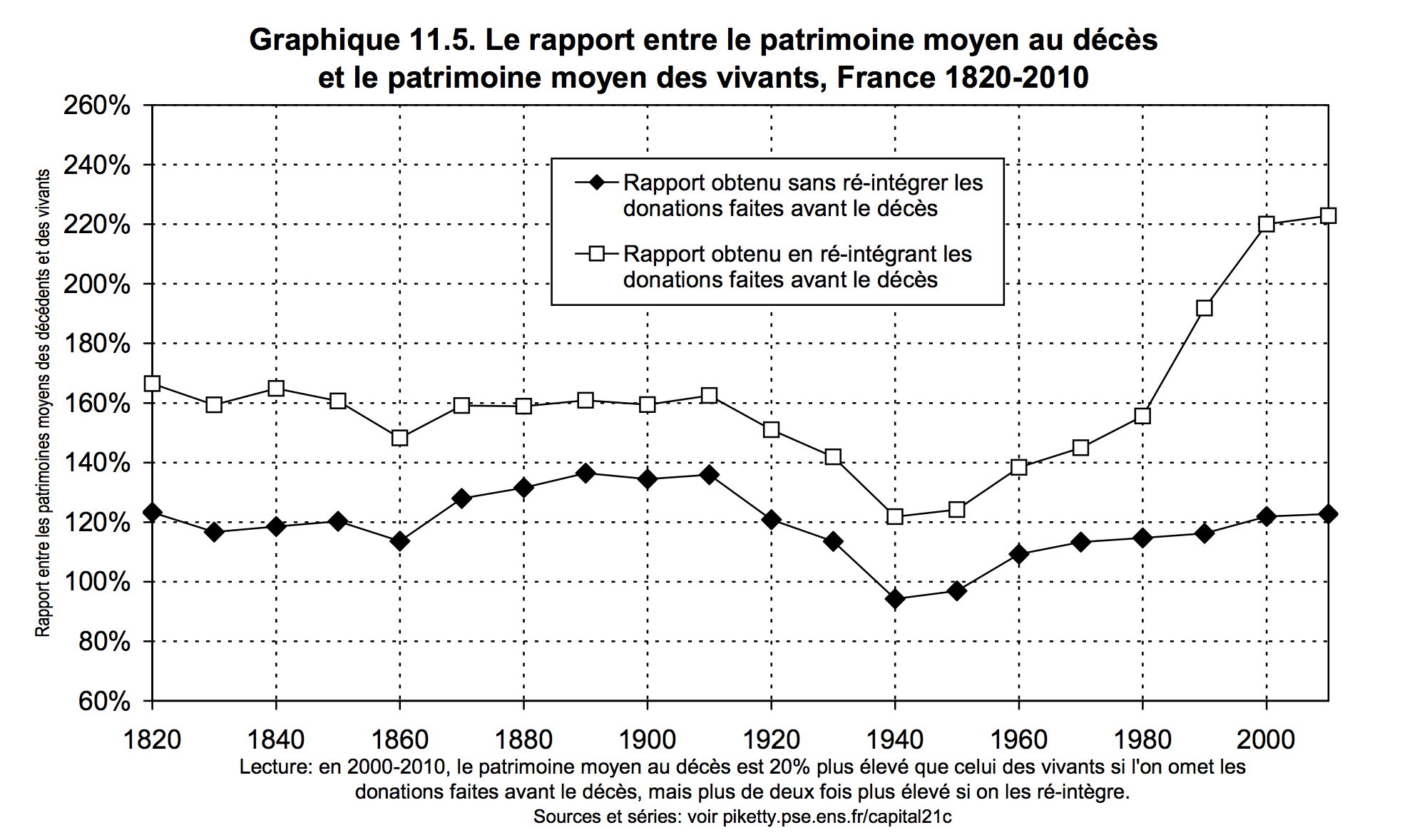 De stelling dat sparen uitgestelde consumptie is, is gebaseerd op de assumptie dat mensen wat ze sparen tijdens hun loopbaan uitgeven tijdens hun pensioen (de Modigliani life-cycle hypothesis in het jargon). Dit zou betekenen dat mensen bij hun dood geen vermogen meer bezitten, of toch zeker minder dan wat ze bezaten op de dag dat ze op pensioen gingen. Wat zeggen de data hierover? Ik ga even te rade bij Thomas Piketty, die de gegevens voor Frankrijk heeft verzameld. We kunnen niet nagaan of die voor België er ook zo uitzien, maar ik zie niet in waarom de grootte-ordes significant zouden verschillen.